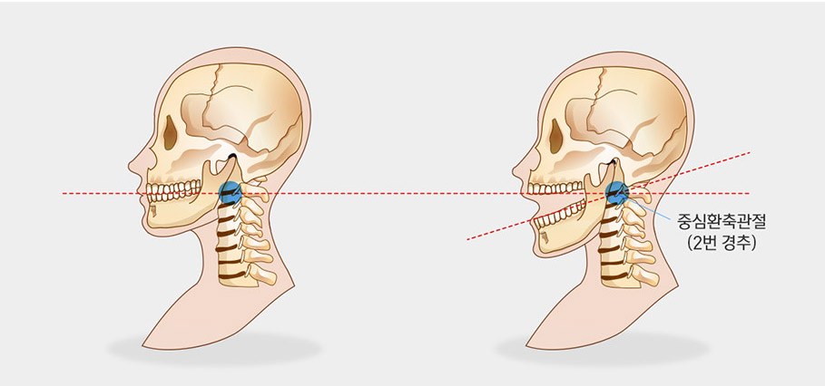턱관절은 2번 경추를 중심축으로 움직이며, 1번/2번 경추의 관절면과 치아교합평면은 일치하게 됩니다. 따라서 1, 2번 경추가 틀어지면 턱관절은 따라서 불안정해집니다.