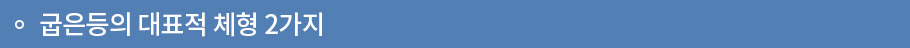 굽은 등 교정은 일자목(거북목)과 더불어 가장 잘 교정 될 수 있는 체형으로, 일반적으로 중상은 목, 어깨 주변이 항상 불편하고, 쉽게 피로감을 호소하며, 목디스크가 이미 진행되었거나 심하지 않은 퇴행성 변화 정도가 있는 경우가 많습니다. 그리고 심한 굽은등이거나 측만증과 동반되면 폐기능저하까지 올 수 있습니다.